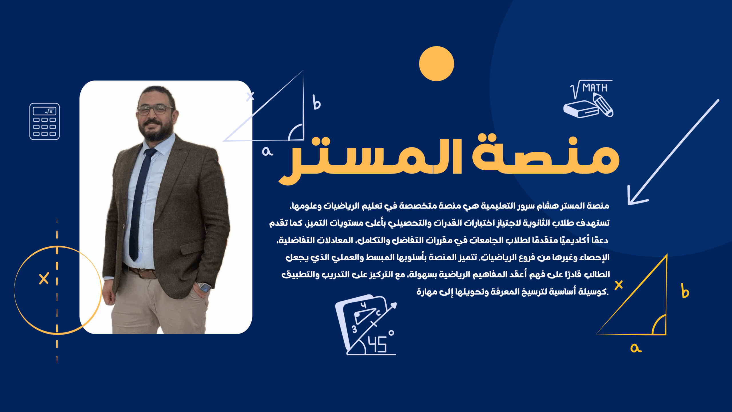 تسعى منصة المستر هشام سرور التعليمية إلى تقديم تجربة تعليمية متميزة في الرياضيات، تجمع بين البساطة والعمق، وتعتمد على الشرح الواضح، التدريب المكثف، والتقنيات الحديثة، لتمكين الطلاب من تحقيق أعلى النتائج في اختباراتهم، مع إرساء حب الرياضيات كأداة للفكر والتطور والإبداع.